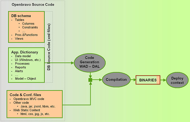 The process to build the system from openbravo source code includes a number of steps to generate the code at different levels (DAL, WAD and others) and put together that code with other code directly written by developers. Openbravo has automated this process through an ant task.